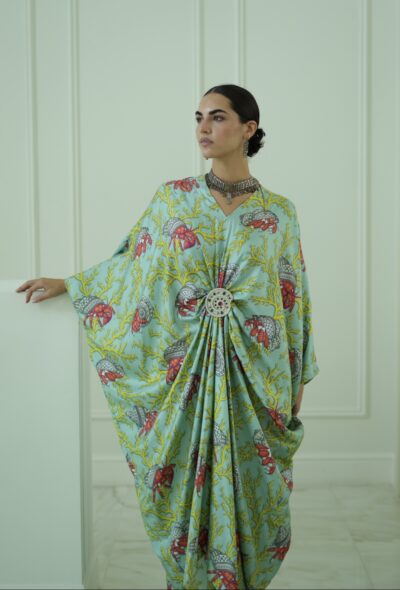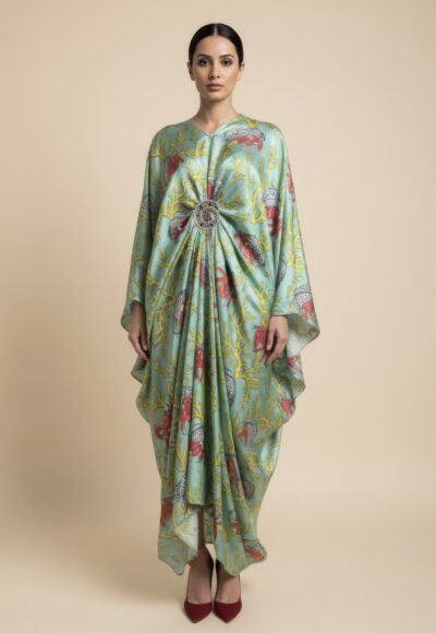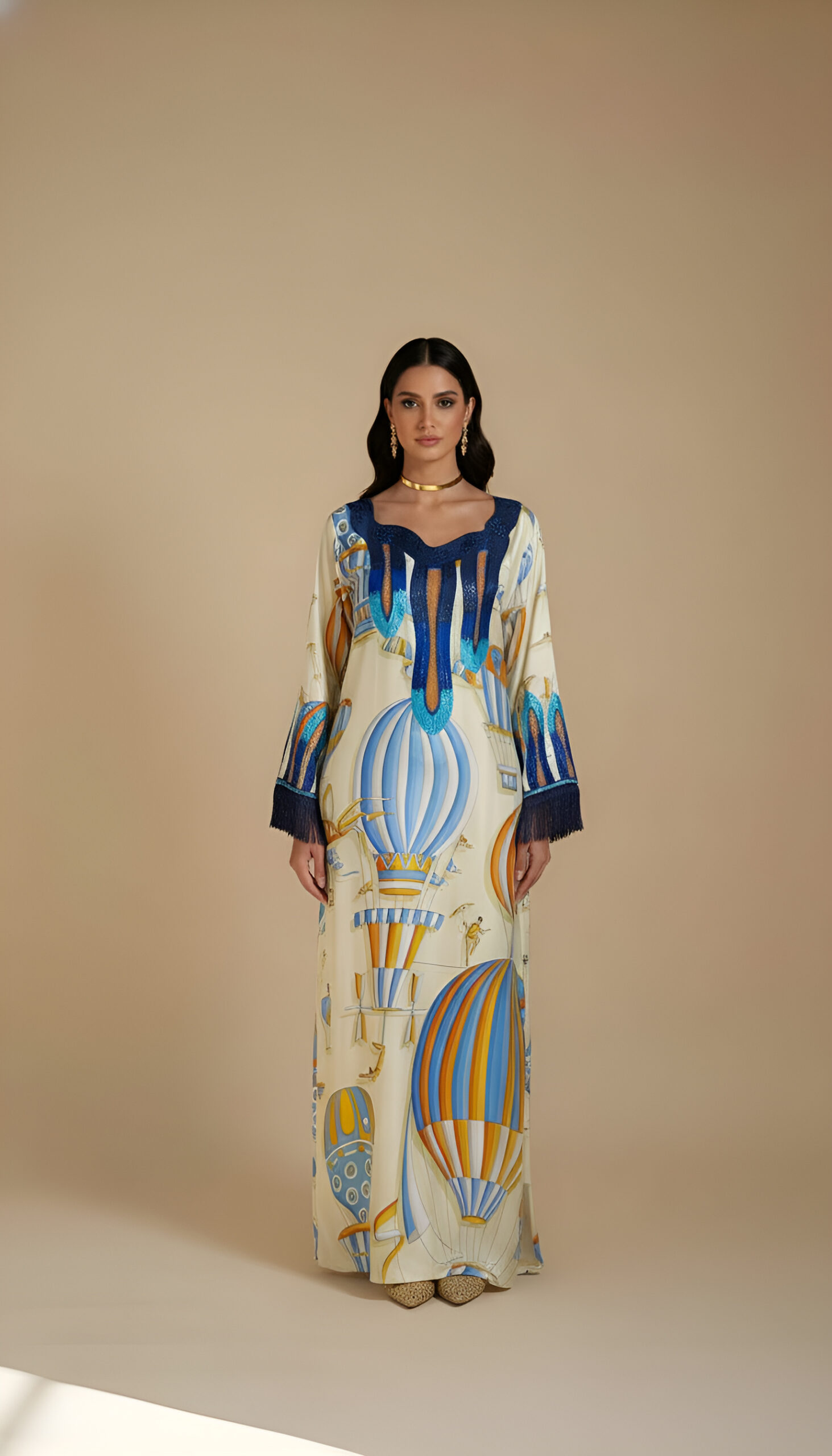 This exquisite piece is crafted from luxurious Italian silk, featuring exclusive, one-of-a-kind prints that elevate its elegance. The design blends intricate machine and hand embroidery, creating a beautiful harmony of texture and detail. The sleeves are adorned with delicate navy blue fringe, adding a playful yet sophisticated touch. The neckline and sleeves showcase stunning ombré thread work, with a gradient effect that enhances the flow of the design. This garment is a perfect fusion of traditional craftsmanship and modern style, offering an opulent and unique addition to your wardrobe.