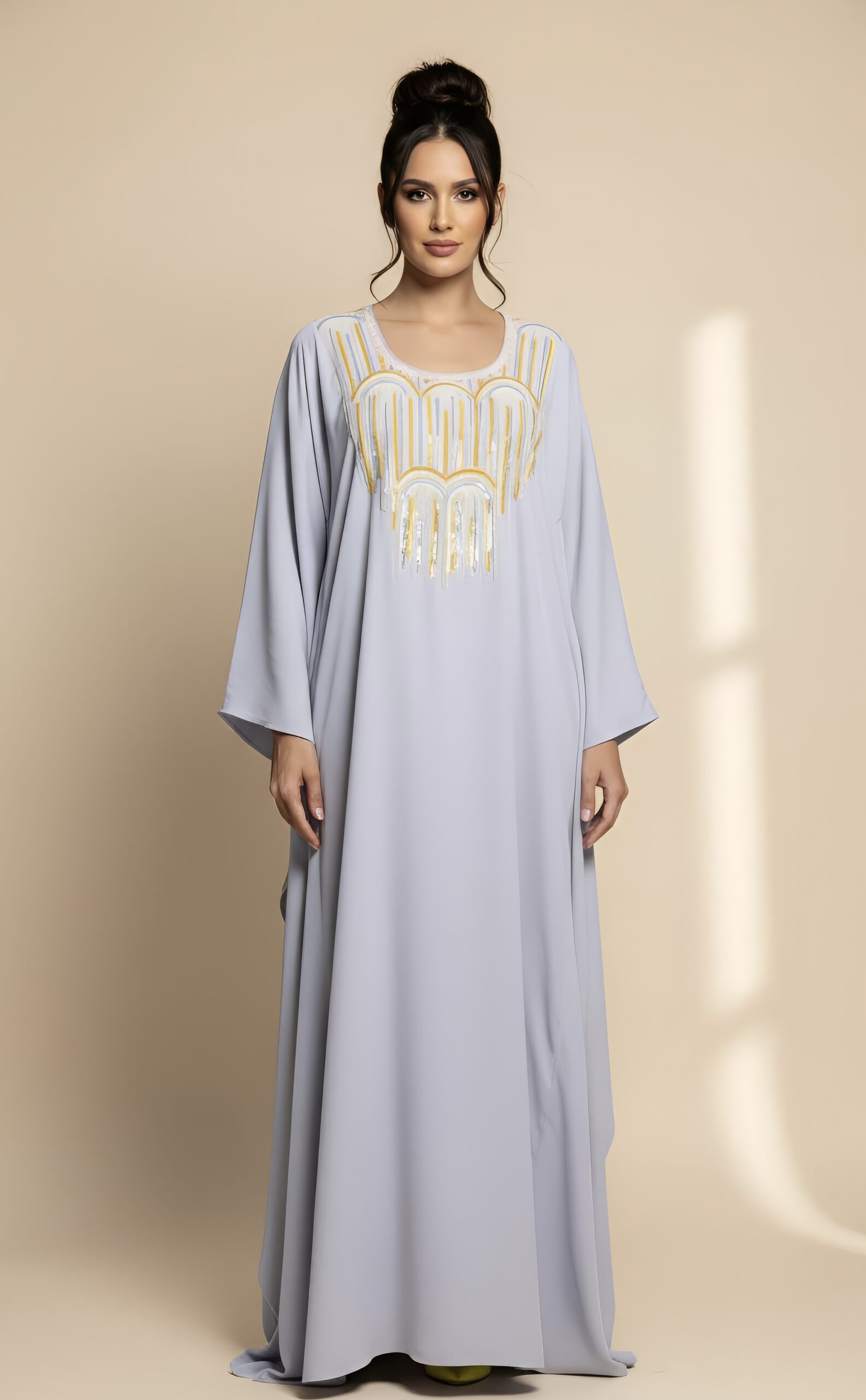 This elegant kaftan-cut dress combines effortless style with comfort. Featuring a beautifully hand-embroidered neckline, the intricate detailing adds a touch of artistry to the relaxed silhouette. Designed as a free size, the dress offers a loose, flowing fit that ensures comfort and freedom of movement.