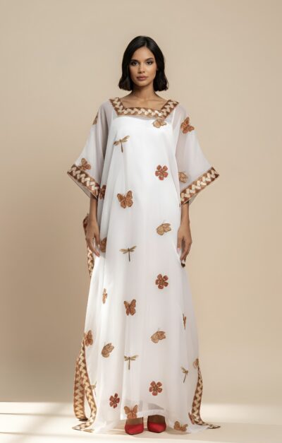 foliage. The neckline mirrors this embroidery style but is delicately uplifted with the addition of